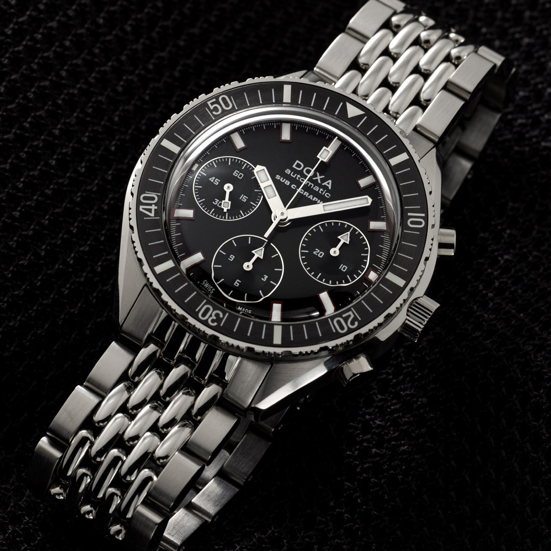 The mechanical automatic chronograph (28,800 vph, 4.0 Hz, 27 jewels) is a Tri-Compax model with three counters for keeping track of dive times and a unidirectional rotating steel bezel with the minute indication highlighted in white Super-Luminova™.