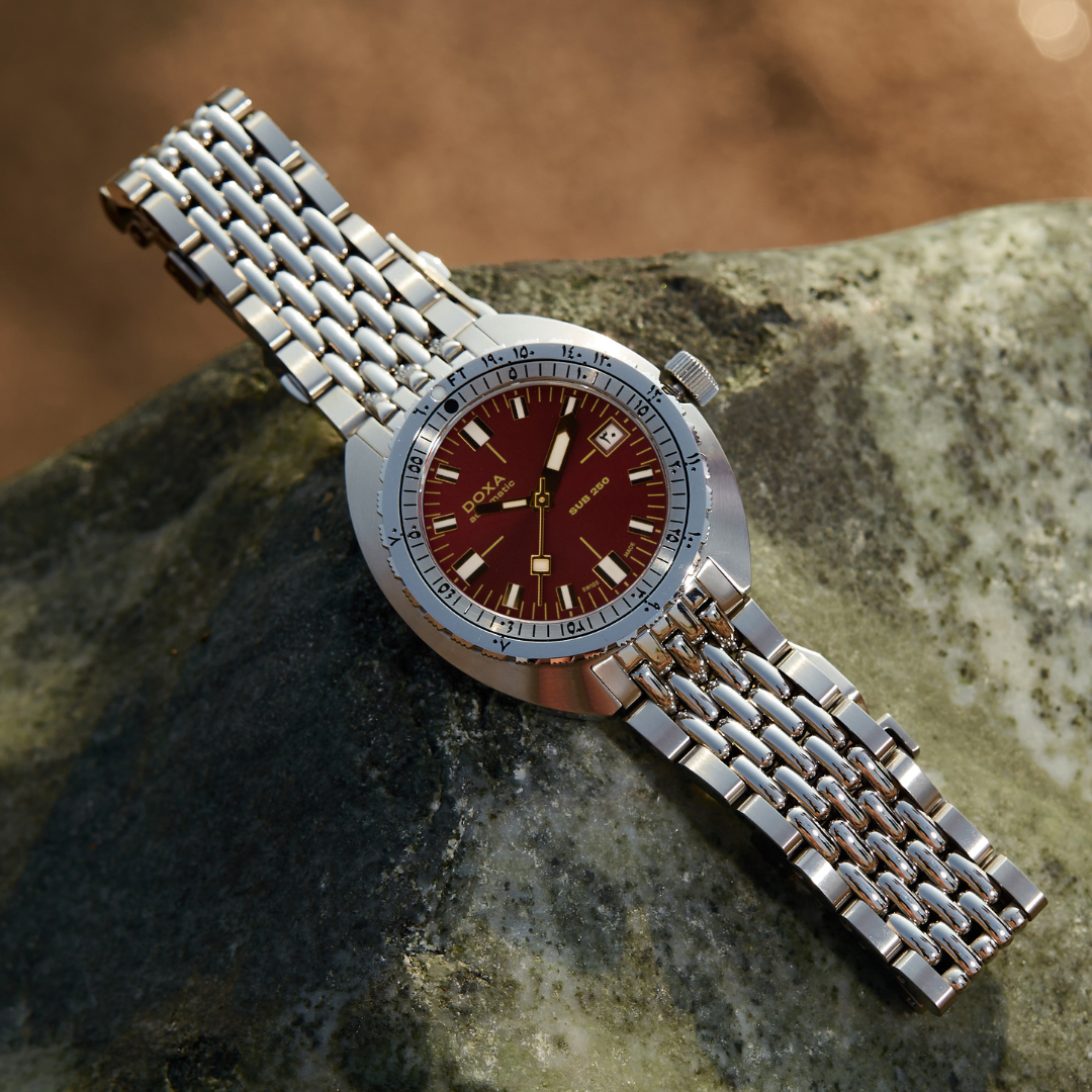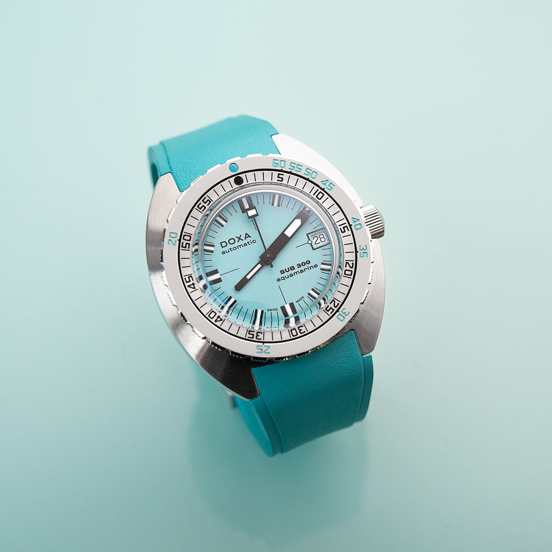 Unveiled at Baselworld 2019, this 3-hand diver's watch has a case made of highest-quality 316L stainless steel. At a diameter of 42 mm, the SUB 200 is topped by a scratch-resistant sapphire crystal with an anti-reflective coating and the distinctive curvature of the domed plexiglass used back in the day. Waterproof to a depth of 200 meters (20 ATM), the model features a unidirectional rotating bezel. All the elements providing dive-relevant information, including the bezel, have a Super‑LumiNova® luminescent coating. The bracelet is 316L stainless steel and features a folding clasp with the DOXA fish symbol.