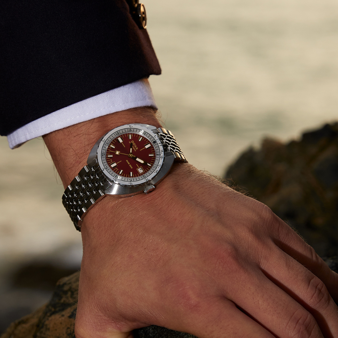 The DOXA SUB 250 Ahmed Seddiqi limited edition marks the 75th anniversary of Ahmed Seddiqi with 75 individually numbered pieces. Its 40 × 42.9 mm cushion-shaped case in 316L stainless steel is equipped with a flat sapphire crystal, screw-down crown, and unidirectional bezel featuring Eastern Arabic numerals, ensuring reliability to 250 meters.