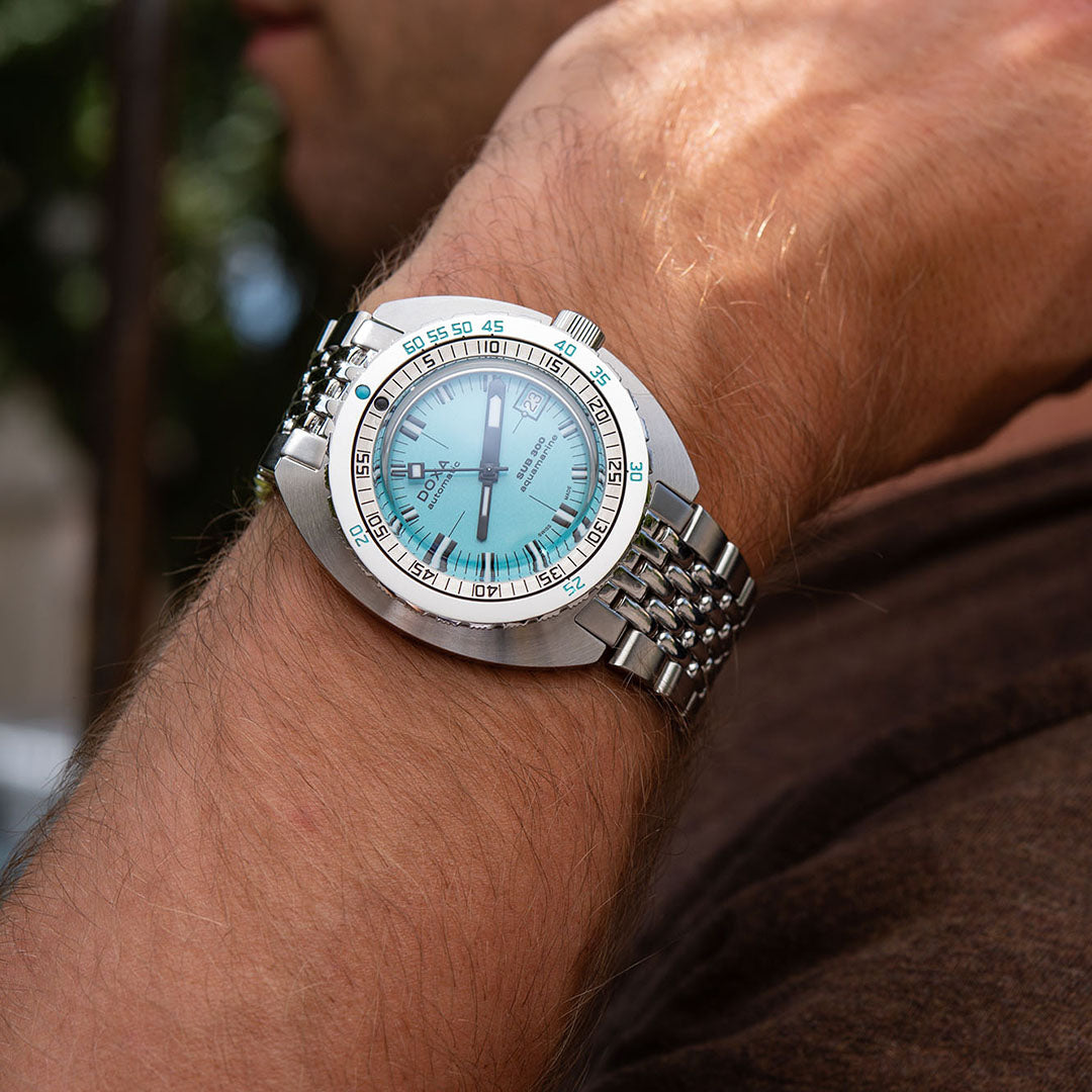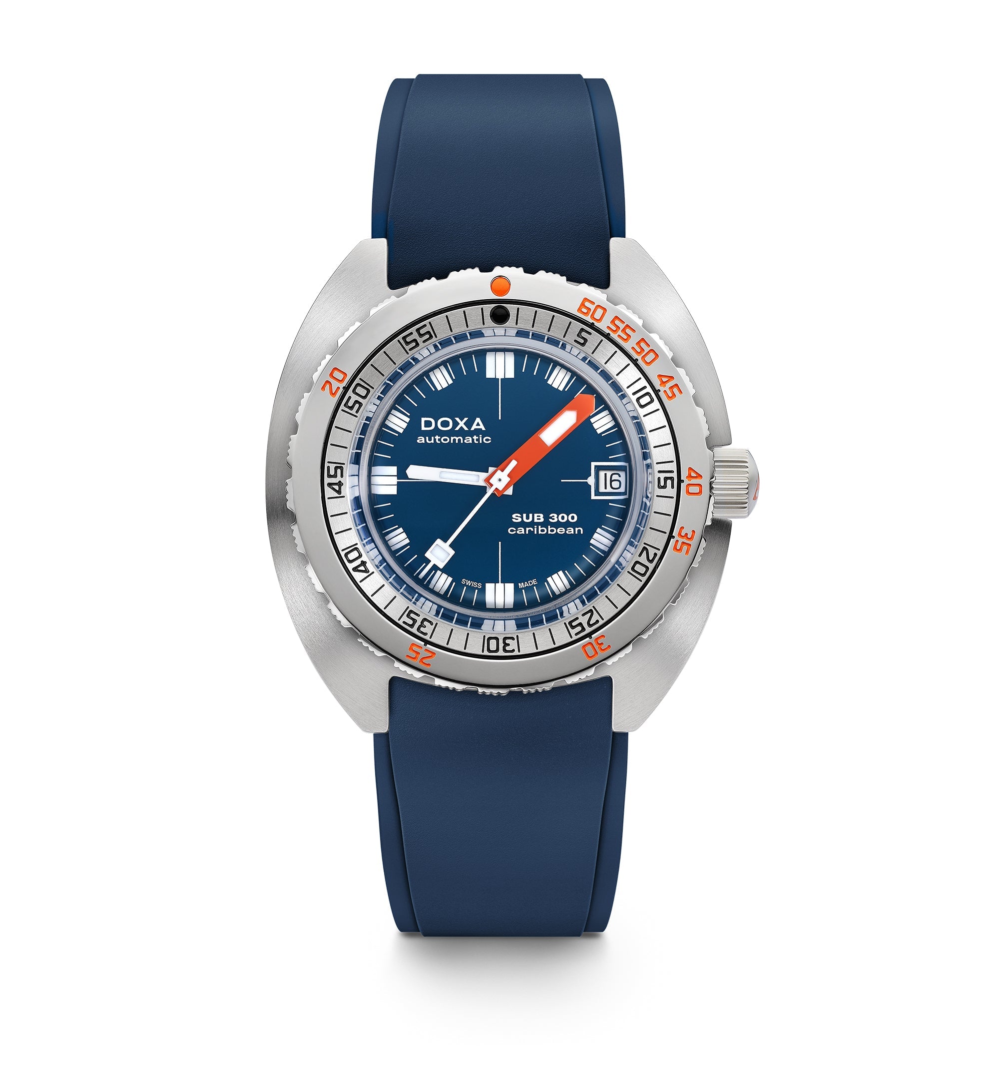 Starting 2020, the SUB 300 will be available in 8 colors. It can be specified either with the iconic ‘beads of rice’ stainless steel bracelet or a sporty rubber strap, with distinctive DOXA cues on both sides, to match the color of the dial. The folding clasp of the rubber strap features the exclusive DOXA fish symbol and has an adjustable diving extension to accommodate the thickness of a wetsuit. The folding clasp of the beads of rice bracelet is equipped with a wetsuit extension.